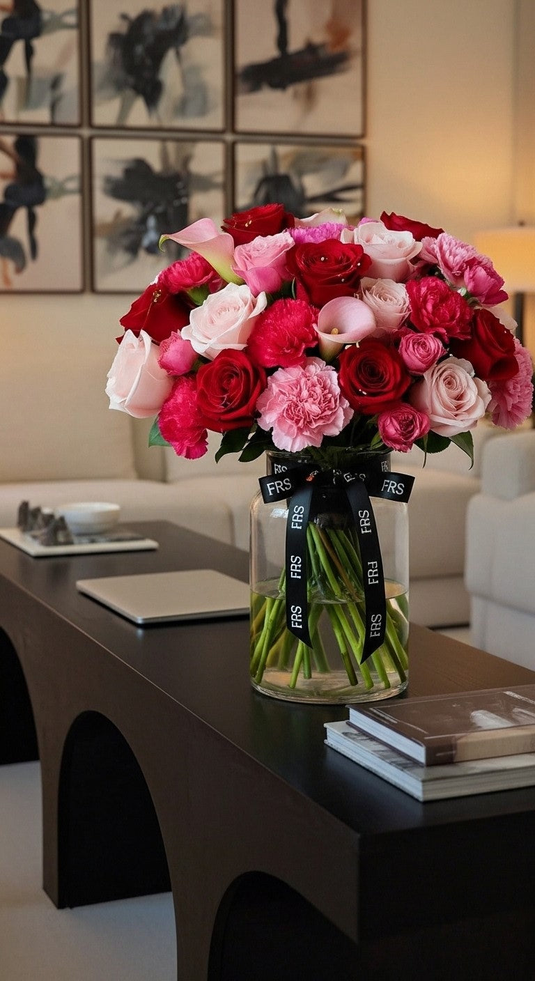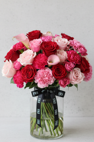 Playful yet polished, Sophia is a romantic arrangement designed to capture joy, warmth, and heartfelt connection. Featuring a bold fusion of red and blush roses, pink carnations, and delicate calla lilies, this arrangement balances classic romance with modern charm.